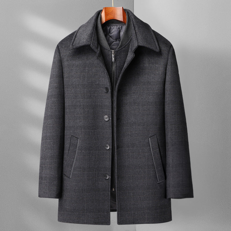 Meet the Kingsman Woolen Mid-Length Coat—elegance in simplicity. Adorned with a light plaid pattern, side pockets, and a classic lapel collar, this coat effortlessly combines style and practicality for a distinguished look in any setting.